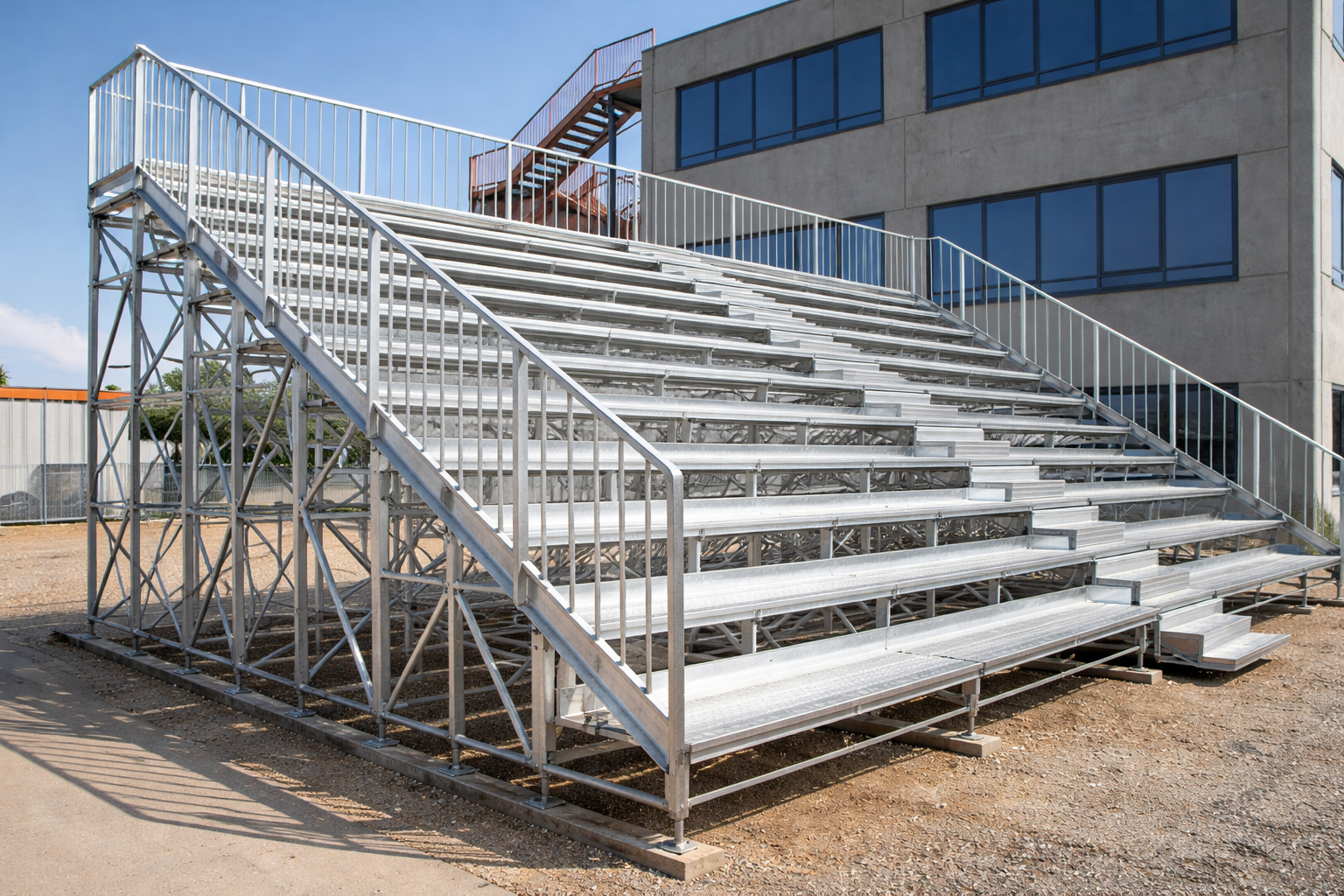При изготовлении большое внимание уделяется жёсткости и устойчивости каркаса, особенно в условиях динамической нагрузки, когда зрители активно перемещаются и создают вибрации. Не менее важны точность геометрии и качество узлов, чтобы секции собирались на объекте без подгонки, а лестницы и площадки вставали в проектные отметки.