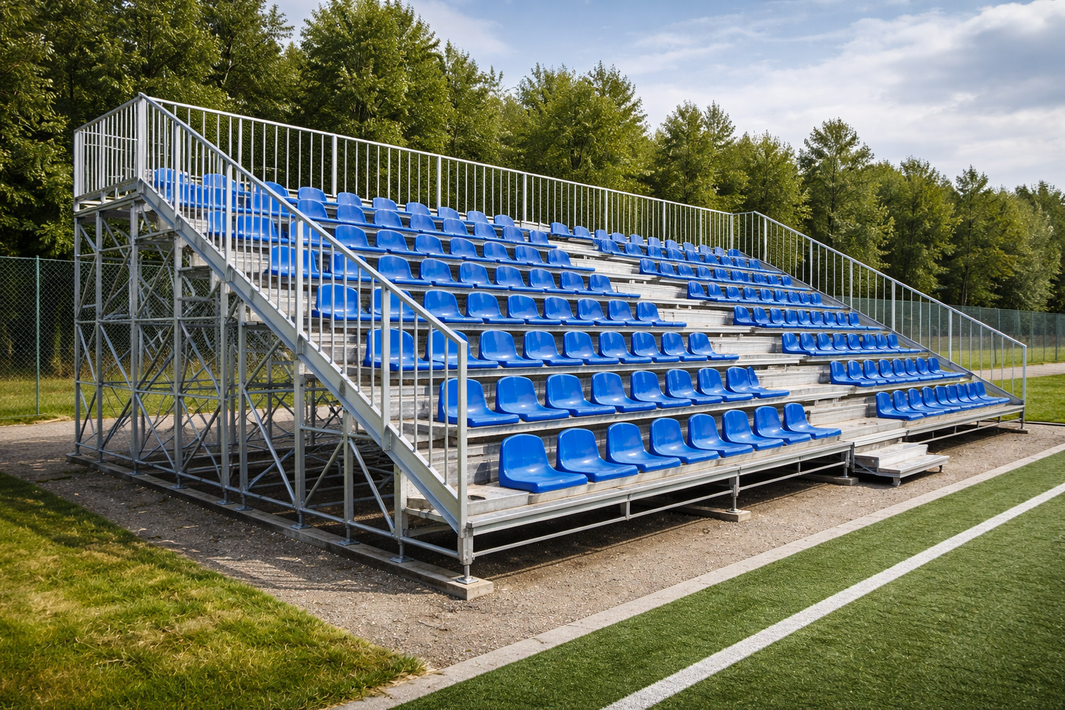 Для уличных трибун критичны настилы и ступени: противоскольжение, удобство ходьбы, безопасная эксплуатация в дождь и мороз, а также простая очистка от грязи и снега. Отдельно прорабатываются ограждения и поручни — их высота, жёсткость и узлы крепления должны оставаться надёжными при постоянной эксплуатации.