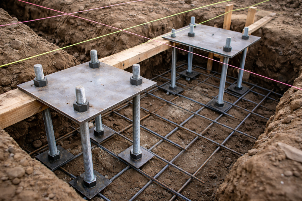 Фундаментные болты (анкерные группы) — это крепёжные элементы, которые обеспечивают точное и надёжное соединение металлоконструкций с фундаментом. Через анкера фиксируются опорные плиты колонн, стойки навесов, рамы, опоры инженерных конструкций и оборудование. Анкерная группа не просто «держит», а задаёт геометрию узла: шаг, осевые привязки и отметки, от которых зависит, насколько быстро и без переделок соберётся металлокаркас.